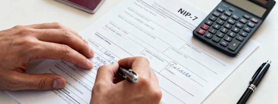 Procedura uzyskania NIP w 2026 roku dla cudzoziemca bez PESEL jest dość przewidywalna. Składasz formularz NIP-7 do właściwego urzędu skarbowego, dołączasz kopię paszportu i ewentualne załączniki potwierdzające związek z Polską.